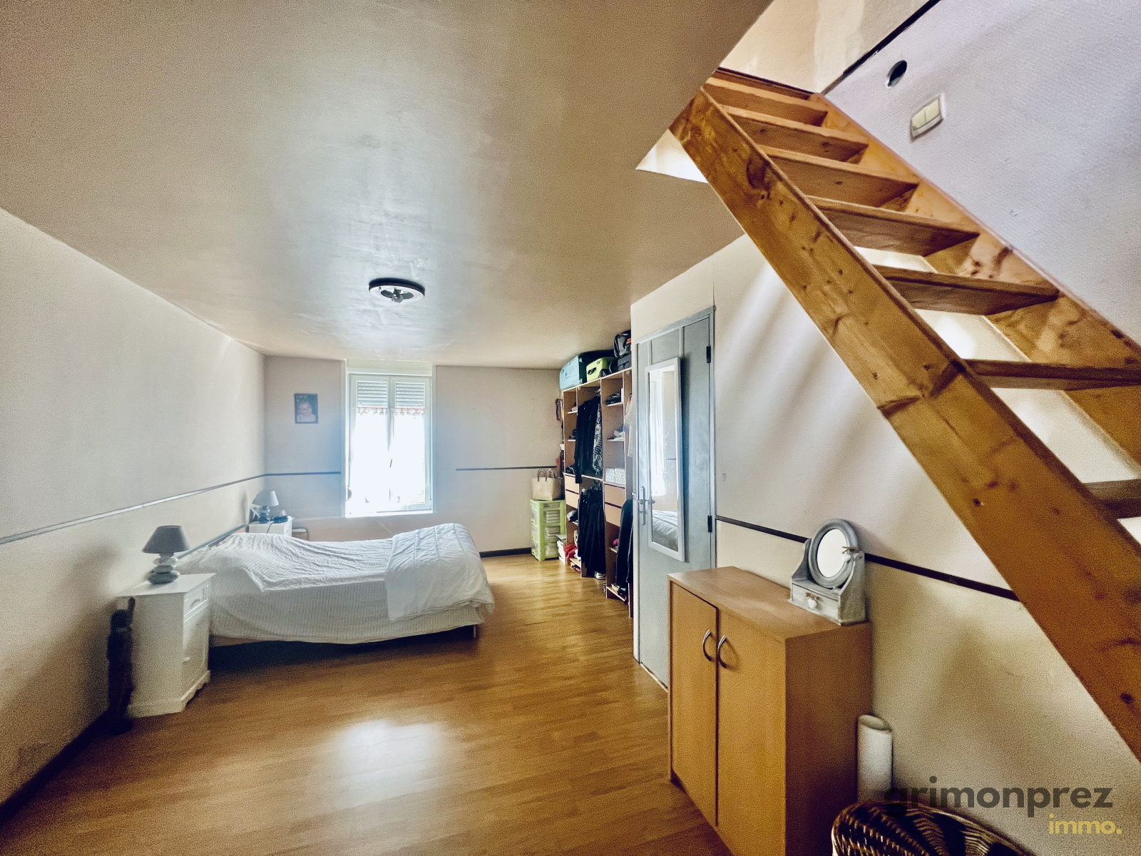 A l'étage : Une chambre passante de 19m² avec coin bureau.